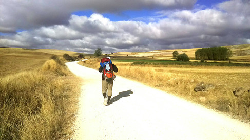 余りにもの絶景にテンションが上がり、アドレナリンが大量に分泌されてたせいか、かなりのハイペースで歩きました。途中、羊の群れに出くわしたり、青い空と果てしなく続く道に感動したり、道行く人にBuen Camino!(良い巡礼を!)と挨拶を交わしたり、なんやかんやで初日から33㎞程歩く。